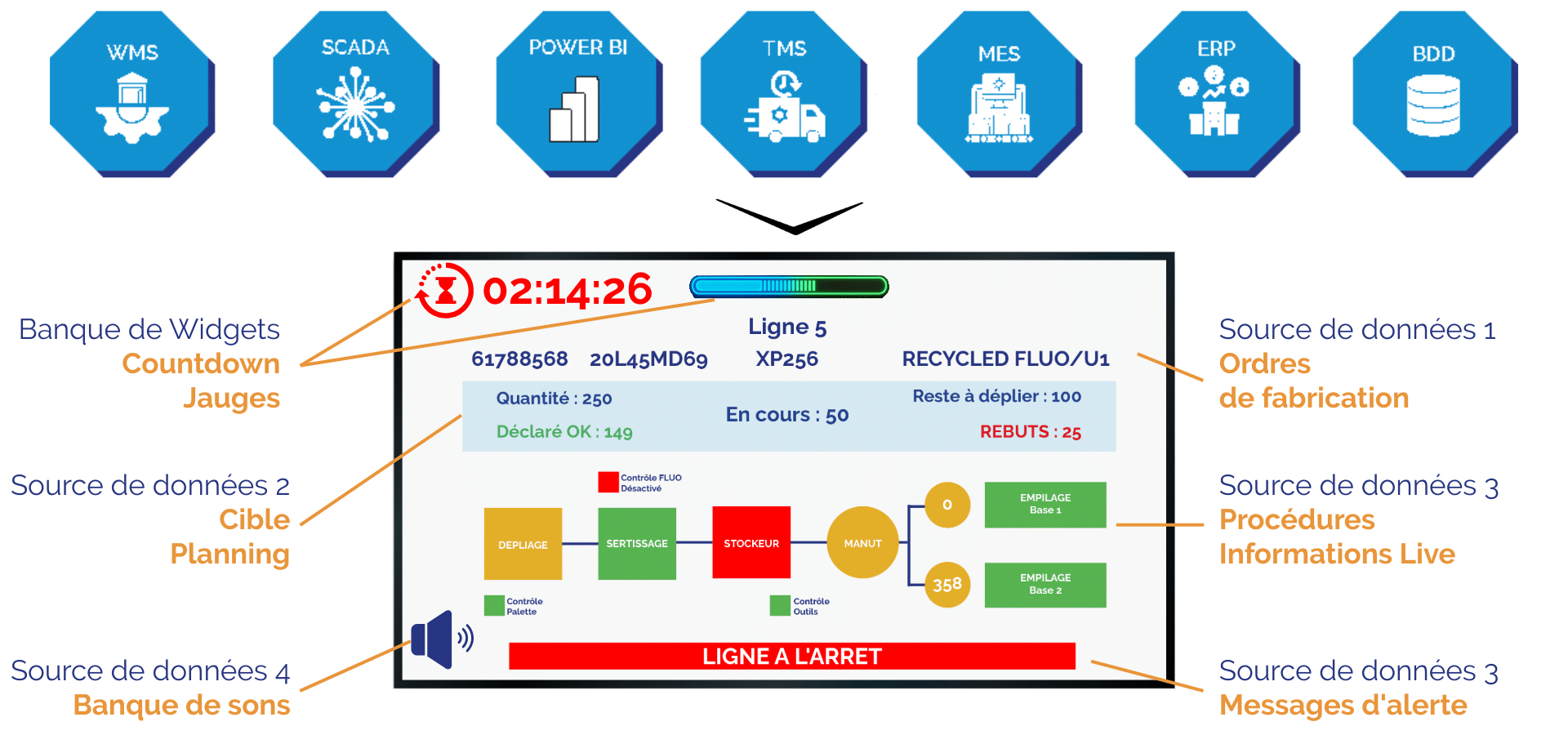 Blog Andon digital : un levier clé pour la performance industrielle Andon digital : un levier clé pour la performance industrielle 26 septembre 2025 Les arrêts de production, même courts, peuvent représenter des pertes importantes, tant sur le plan opérationnel que financier. Depuis des décennies, les systèmes Andon sont utilisés pour signaler rapidement les incidents en atelier, en particulier dans l’automobile et les industries de process. Historiquement matérialisé par des colonnes lumineuses ou des signaux sonores, l’Andon a évolué avec la digitalisation des ateliers. Aujourd’hui, on parle d’Andon digital : un système visuel intégré aux écrans d’affichage dynamique, connecté aux données de production et aux outils de pilotage. Ilpermet une gestion en temps réel des anomalies et une communication transparente avec l’ensemble des équipes. Plan de l'article : Qu’est-ce que l’Andon digital ? Les bénéfices de l’Andon digital via l’affichage dynamique Réactivité accrue et réduction des temps d’arrêt Amélioration de la communication et de la transparence Autres bénéfices complémentaires Comment mettre en place un Andon digital ? Identifier les flux critiques Connecter les sources de données Définir les scénarios d’alerte Construire les tableaux visuels Déployer les écrans aux bons endroits Former et impliquer les équipes Comment Media4Display facilite l’Andon digital ? Qu’est-ce que l’Andon digital ? Le terme Andon vient du japonais et signifie « lanterne ». Introduit dans les usines Toyota dans le cadre du système de production Lean, il désignait à l’origine un dispositif visuel ou sonore pour signaler un problème en ligne de production. L’opérateur, en tirant un cordon ou en appuyant sur un bouton, pouvait alerter immédiatement son superviseur. L’Andon digital conserve ce principe fondamental – le signalement immédiat d’un problème – Le déclenchement peut provenir aussi bien d’une action humaine (opérateur) que d’un processus automatisé : capteurs IoT, franchissement de seuils définis dans des bases de données ou encore remontées issues des outils métier (MES, ERP, SCADA…). Au lieu de simples colonnes lumineuses, l’information est diffusée sur des écrans d’affichage dynamique, enrichie de données précises : type de problème (qualité, panne, maintenance, approvisionnement), poste ou machine concernée, temps écoulé depuis le déclenchement, priorisation de l’intervention. L’Andon digital s’inscrit pleinement dans le management visuel et dans une démarche de Lean Manufacturing, en rendant les problèmes visibles à tous et en favorisant une réaction rapide. Les bénéfices de l’Andon digital via l’affichage dynamique 1. Réactivité accrue et réduction des temps d’arrêt Un des avantages majeurs de l’Andon digital est la rapidité d’intervention. Réactivité dès la détection : grâce au déclenchement automatisé en fonction de critères (détection IoT, atteintes de seuils, etc, …) , les incidents sont signalés instantanément, sans attendre l’action d’un opérateur Alertes précises et détaillées : contrairement aux colonnes lumineuses traditionnelles, les écrans affichent des informations complètes : nature de l’incident, emplacement, responsable à contacter, chronométrage du temps écoulé. Information visible par tous : l’affichage dynamique rend l’alerte collective. Les équipes de maintenance ou de supervision peuvent intervenir immédiatement, sans perte de temps. Moins de « goulots d’étranglement » : la résolution rapide des incidents évite qu’un problème localisé ne se transforme en arrêt général de la ligne. Résultat : les temps d’arrêt sont réduits, la disponibilité des équipements augmente, et la réactivité devient un avantage compétitif. 2. Amélioration de la communication et de la transparence L’Andon digital ne se limite pas à signaler les problèmes : il centralise et diffuse l’information utile à tous. Tableau de bord partagé : les écrans deviennent une source unique de vérité, affichant objectifs, résultats réels et incidents en temps réel. Données visuelles enrichies : graphiques, jauges, indicateurs permettent de comprendre rapidement la situation et d’identifier les causes racines. Transparence renforcée : chaque membre de l’équipe voit la même information, ce qui favorise la responsabilisation et la confiance. Cohésion accrue : en impliquant opérateurs, techniciens et management dans la résolution des problèmes, l’Andon digital nourrit la culture d’amélioration continue. Vous souhaitez mettre en place un système d'Andon digital dans vos ateliers ? Contactez-nous 3. Autres bénéfices complémentaires Au-delà de la réactivité et de la communication, l’Andon digital offre d’autres avantages stratégiques : HSE et sécurité : signalement immédiat d’incidents de sécurité, diffusion de consignes ou alertes en cas de danger. Zéro papier : suppression des documents manuels, avec une information directement digitalisée et affichée. Multi-sites et évolutif : possibilité de piloter plusieurs ateliers ou sites depuis une plateforme centralisée. Lien avec l’IoT : les capteurs connectés enrichissent l’Andon digital, en détectant automatiquement certaines anomalies (température, vibration, énergie). Critère Andon traditionnel Andon digital Support Colonnes lumineuses, voyants, signaux sonores Écrans d’affichage dynamique, dashboards connectés Type d’information Signal simple (lumière, couleur, son) Informations détaillées : type de problème, poste concerné, temps écoulé, données chiffrées Portée de l’alerte Locale, visible uniquement dans l’atelier concerné Diffusion élargie : atelier, site complet, voire multi-sites Réactivité Intervention déclenchée après identification manuelle du problème Alerte immédiate et contex