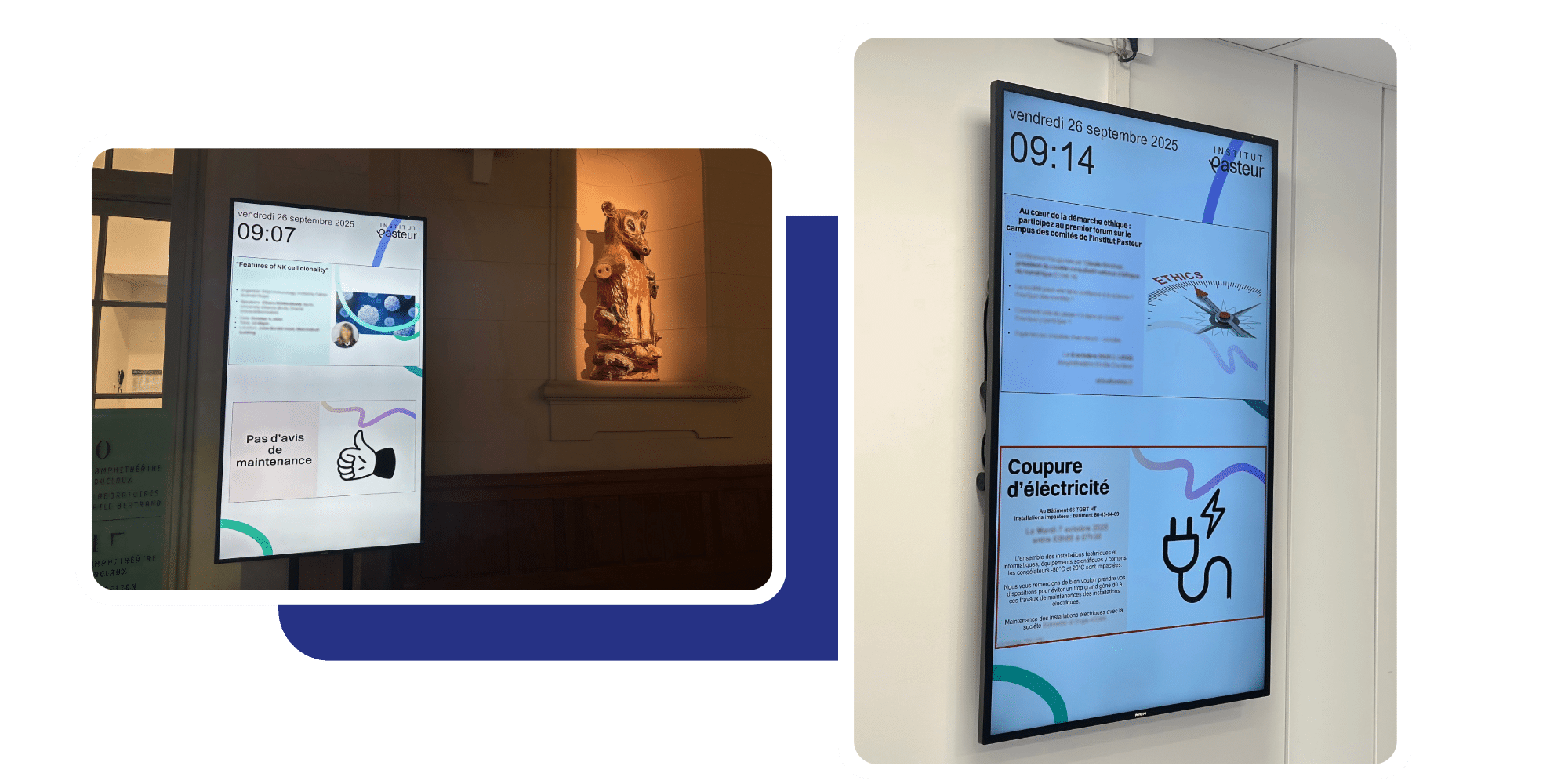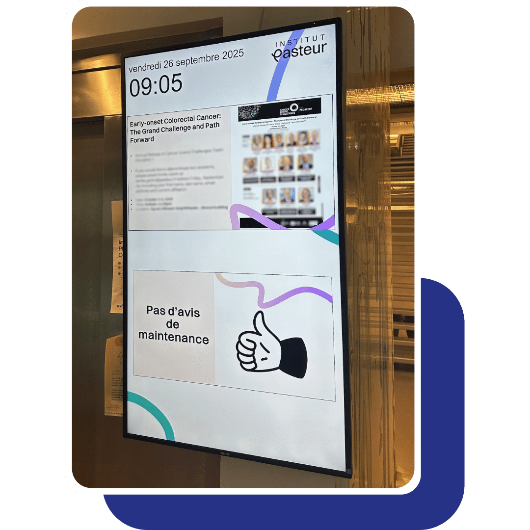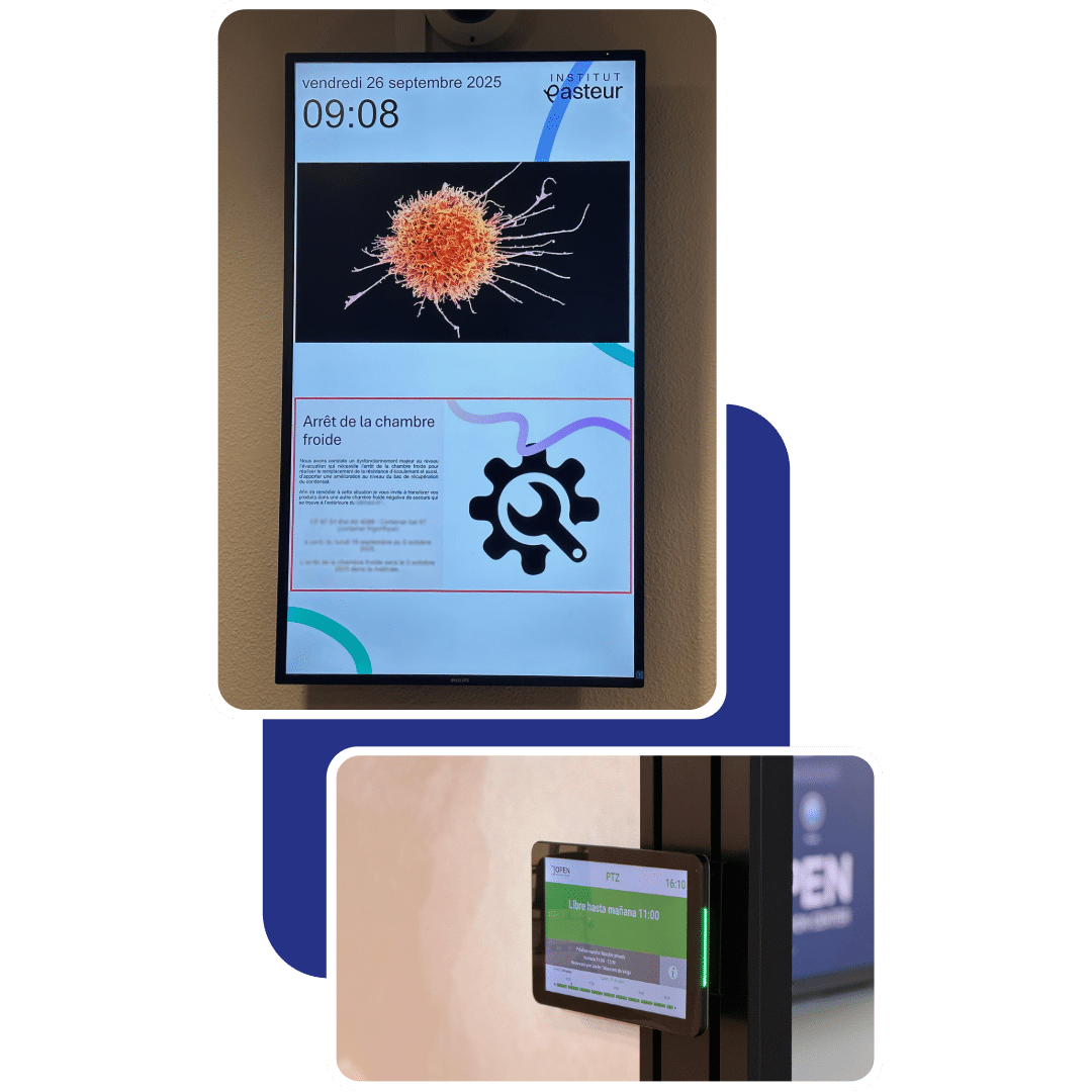 Casos de éxito Media4Display El Instituto Pasteur optimiza su comunicación y su gestión de espacios El Instituto Pasteur optimiza su comunicación y su gestión de espacios Fundación reconocida de utilidad pública, creada por decreto en 1887 por iniciativa de Louis Pasteur, el Instituto Pasteur es hoy un centro de investigación biomédica de renombre internacional. Para llevar a cabo su misión dedicada a la lucha contra las enfermedades, en Francia y en el mundo, el Instituto Pasteur desarrolla sus actividades en cuatro áreas: investigación, salud pública, formación y desarrollo de aplicaciones derivadas de la investigación. Líder mundial reconocido en el ámbito de las enfermedades infecciosas, la microbiología y la inmunología, el Instituto Pasteur se dedica al estudio de la biología del ser vivo. Sus trabajos abarcan enfermedades infecciosas emergentes, resistencia a los antimicrobianos, ciertos tipos de cáncer, enfermedades neurodegenerativas y patologías relacionadas con la conectividad cerebral. Para reforzar la excelencia de sus investigaciones, el Instituto Pasteur dispone y desarrolla un entorno tecnológico de muy alto nivel, como en nanoimagen, biología computacional e inteligencia artificial. Desde su creación, 10 investigadores que han trabajado en el Instituto Pasteur han recibido el Premio Nobel de Medicina, los últimos en 2008, en reconocimiento a su descubrimiento en 1983 del virus de la inmunodeficiencia humana (VIH) responsable del sida. El Instituto Pasteur es uno de los miembros del Pasteur Network, una red mundial de 33 instituciones presentes en los cinco continentes, unidas por valores pasteurianos comunes y que contribuyen a la mejora de la salud humana. Desde el 1 de julio de 2021, el Instituto Pasteur es una institución de investigación asociada a la Universidad Paris Cité. El Instituto Pasteur emprendió una renovación completa de su sistema de cartelería digital interna y de su gestión de espacios. La organización buscaba una solución fiable, escalable y respaldada por un soporte reactivo. Es en este contexto que Pasteur eligió Telelogos, convencido por la calidad del acompañamiento humano y la robustez de sus soluciones. Hoy, dos soluciones Telelogos están desplegadas en el corazón de las instalaciones: Media4Display (cartelería digital) y Meeting4Display (reserva de salas de reuniones). Media4Display: la cartelería digital al servicio de la comunicación científica 38 pantallas equipan ahora los distintos edificios repartidos en varios sitios del Instituto Pasteur. Organizadas en cuatro grupos, cada una responde a un objetivo específico: 1. Comunicación institucional en los espacios de convivencia – difundir los mensajes clave y poner en valor los logros internos En el Instituto Pasteur, las pantallas instaladas en espacios de convivencia desempeñan un papel central en la comunicación interna. Permiten difundir de manera eficaz los mensajes institucionales, las noticias estratégicas y los proyectos impulsados por los equipos. Estos soportes fomentan la cohesión y el orgullo de pertenencia al destacar los éxitos colectivos, los avances científicos y las iniciativas internas. La cartelería digital contribuye así a reforzar la cultura organizacional, a agilizar la circulación de la información y a mantener un vínculo constante entre las distintas comunidades del Instituto. 2. Comunicación para eventos en el centro de conferencias – apoyar más de 100 eventos cada año El centro de conferencias del Instituto Pasteur acoge cada año más de 100 eventos, desde coloquios científicos hasta seminarios internos. Las pantallas desempeñan un papel clave en la acogida y orientación de los participantes, además de reforzar la imagen del Instituto. Totalmente personalizables, los contenidos difundidos se adaptan a cada evento: programa, señalización dinámica, presentación de ponentes o difusión de mensajes institucionales. Este dispositivo aporta flexibilidad y reactividad a los equipos organizadores, garantizando una experiencia fluida y profesional para los visitantes. PODEMOS ACONSEJARLE ¿Desea optimizar su comunicación mediante cartelería digital? Contáctenos 3. Comunicación pedagógica en el centro de formación – un canal esencial para informar y motivar a los futuros investigadores En el centro de formación del Instituto Pasteur, la cartelería digital constituye un canal privilegiado de comunicación hacia los estudiantes y jóvenes investigadores. Las pantallas difunden en tiempo real información práctica, noticias científicas, recordatorios de seguridad… La cartelería digital apoya la misión pedagógica del Instituto: fomenta la implicación, estimula la curiosidad científica y refuerza el sentimiento de pertenencia a una comunidad de excelencia. Al digitalizar la difusión de mensajes, contribuye a crear un entorno de aprendizaje dinámico, conectado y motivador. 4. Comunicación multisourcing – un dispositivo reactivo para todos los servicios internos Descubrir Media4Display Pasteur ha implantado un dispositivo denominado de comunicación multisourcing, pensado para difundir rápidamente información procedente de varios servicios: RR. HH., servicios generales, informática, etc. Este modo de difusión ofrece la flexibilidad y la reactividad necesarias para que cada servicio gestione sus comunicaciones con total autonomía, con la posibilidad de adaptar los contenidos en tiempo real según el contexto o el edificio. 14 pantallas con este sistema están distribuidas en 12 edificios, cada una pudiendo difundir una combinación específica de contenidos: Algunas secuencias son comunes a todo el sitio (mensajes institucionales, alertas, información general). Otras son específicas de un edificio (por ejemplo, comunicaciones científicas relacionadas con el área de investigación temática alojada allí, o mensajes de seguridad difundidos por los servicios técnicos). Esta lógica co